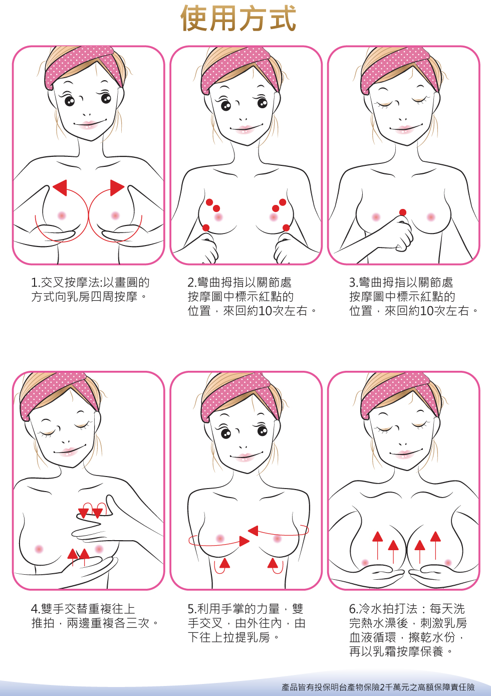 用法用量:清潔並拭乾肌膚後,取適量「美胸精華」塗抹於胸部肌膚按摩至吸收即可