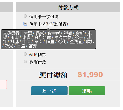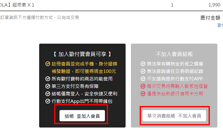 PS: 若您尚未成為歐付寶會員,可以選擇『結帳 並加入會員』開始註冊結帳。若您選擇『單次消費結帳 不加入會員』,系統將會切換至『綠界』的結帳系統,分期銀行僅支援台新、玉山2家銀行。