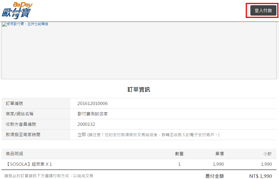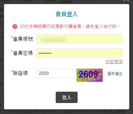 依據第三方支付專法規定使用歐付寶結帳,需要先登入歐付寶會員(實名制認證)。